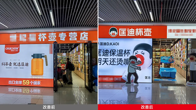走進(jìn)門店,你會(huì)發(fā)現(xiàn)我們把原來(lái)的貨架改造成了“發(fā)光海報(bào)”,匡迪的標(biāo)志、燙嘴哥形象和企業(yè)背書(shū)全都亮在那里,讓人不由自主想進(jìn)店一探究竟。